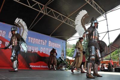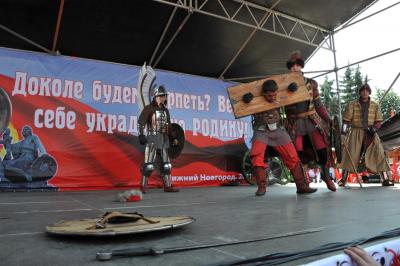 В 11.00 началось собрание движения «Всенародное ополчение имени Минина и Пожарского» в концертном зале «Юпитер». На площади перед концертным залом были установлены агитационные палатки различных региональных организаций, которые приехали на это мероприятие. Сюда прибыли делегации с Дальнего Востока и Сибири, Урала и Поволжья, Центральной России и Калининградской области, русского Севера и Кавказа. На большом баннере изображены Минин и Пожарский, Кутузов и Зюганов. Под изображениями подпись: «1612-1812-2012».