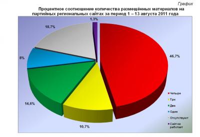 Процентное соотношение количества размещённых материалов на партийных региональных сайтах за период 1 – 13 августа 2011 года