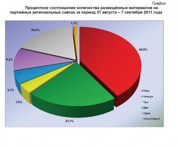 Процентное соотношение количества размещённых материалов на партийных региональных сайтах за период 31 августа – 7 сентября 2011 года