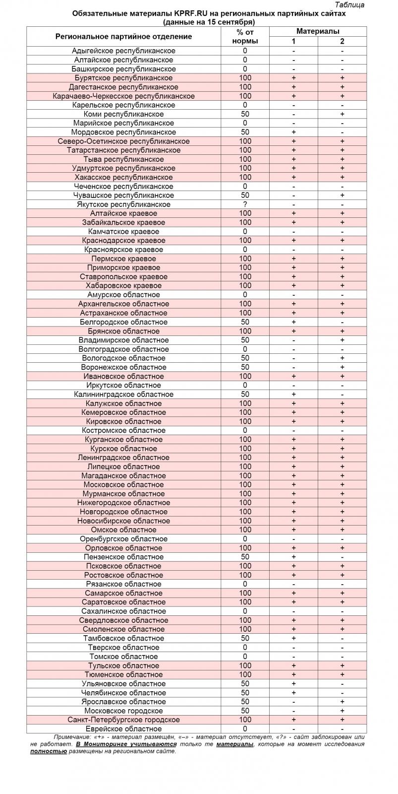 В целях выявления степени соблюдения указанного решения и оценивания качества работы отделений КПРФ в Интернет-пространстве в субъектах Российской Федерации, центральным сайтом KPRF.RU был проведён мониторинг размещения следующих обязательных материалов на региональных сайтах партии: