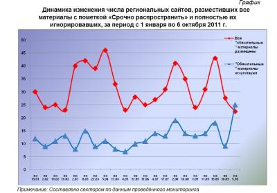 Динамический ряд, отражающий порядок изменения числа региональных сайтов, разместивших все материалы с пометкой «Срочно распространить» и полностью их игнорировавших, за период с 1 января по 6 октября 2011 г., позволяет заключить: