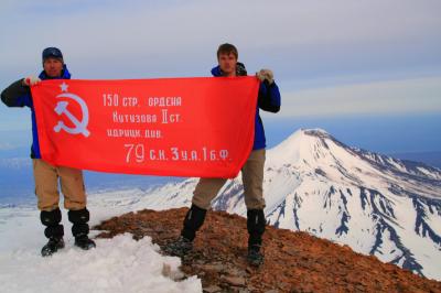 В составе команды восходителей - руководитель группы региональных политтехнологов ЦК КПРФ, кандидат в депутаты Государственной Думы Андрей Червонцев, секретарь по молодёжной политике Камчатского крайкома КПРФ Сергей Конкин, сторонник КПРФ Артём Кабаков. На вершине вулкана они водрузили Красное Знамя Победы.