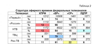 Максимальную долю эфирного времени КПРФ получила на «России» и НТВ (по 12%). Наименьшую долю эфирного времени КПРФ получила на ТВЦ (6%).