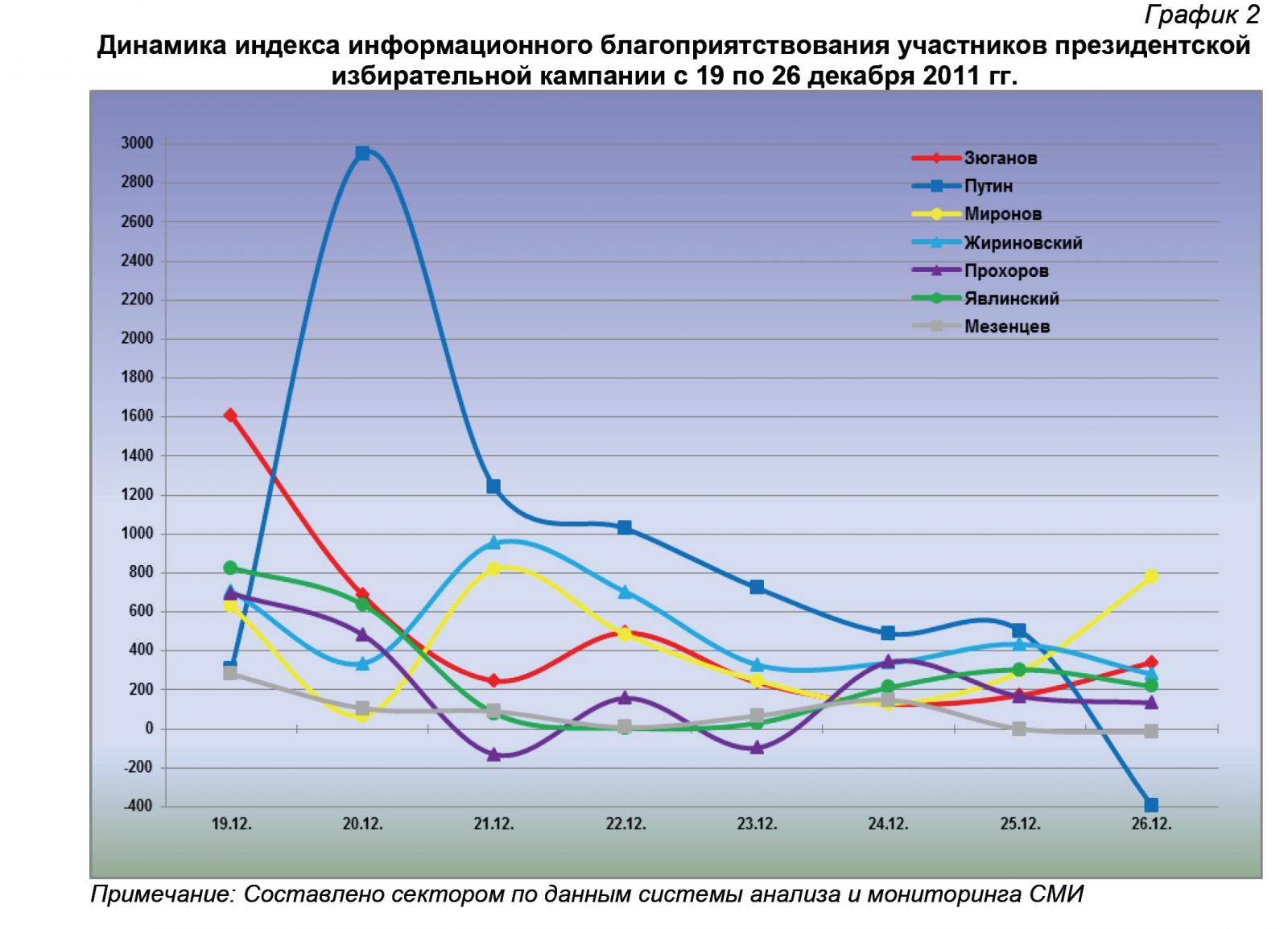 26 декабря лидирующую позицию в рейтинге информационного благоприятствования занял С.М.Миронов, чей индекс информационного благоприятствования (ИИБ) вырос до 779,1 (при 295,4 – в предыдущий день) (график 2).