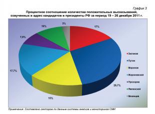Итоговое процентное соотношение количества положительных высказываний, озвученных в адрес кандидатов на пост президента РФ за период 19 – 26 декабря, составило: 29,7% от суммарного ИИБ – за В.В.Путиным, 17,7% - за В.В.Жириновским, 17% - за Г.А.Зюгановым, 15% - за С.М.Мироновым, 10% - за Г.А.Явлинским, 7,6% - за М.Д.Прохоровым и 3% - за Д.Ф.Мезенцевым (график 3).