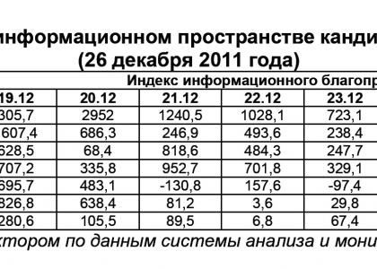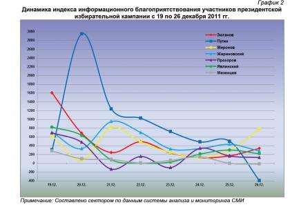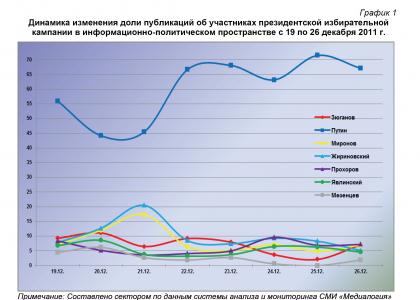 26 декабря 2011 г. в информационном пространстве отмечалось 464 сюжета о В.В.Путине или 67,1% от общего числа высказываний, озвученных в адрес участников президентской избирательной кампании. В 50 материалах (7,2%) фигурировал М.Д.Прохоров, в 49 (7,1%) – Г.А.Зюганов, в 48 (7%) – С.М.Миронов, в 35 (5,1%) – В.В.Жириновский, в 32 (4,6%) – Г.А.Явлинский, а в 13 публикациях (1,9%) – Д.Ф.Мезенцев.