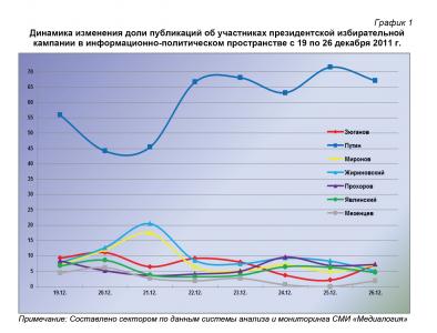 26 декабря 2011 г. в информационном пространстве отмечалось 464 сюжета о В.В.Путине или 67,1% от общего числа высказываний, озвученных в адрес участников президентской избирательной кампании. В 50 материалах (7,2%) фигурировал М.Д.Прохоров, в 49 (7,1%) – Г.А.Зюганов, в 48 (7%) – С.М.Миронов, в 35 (5,1%) – В.В.Жириновский, в 32 (4,6%) – Г.А.Явлинский, а в 13 публикациях (1,9%) – Д.Ф.Мезенцев.