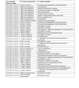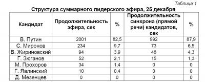 26 декабря на пяти федеральных телеканалах четырём парламентским партиям было посвящено 40 минут 25 секунд новостного лидерского эфира (Таблица 1).