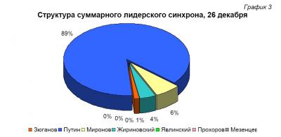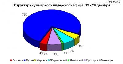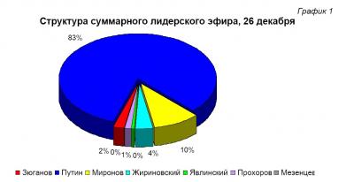 26 декабря соотношение времени, отданного каждому кандидату на пост президента, изменилось по сравнению с 25 декабря следующим образом: М. Прохоров получил 8% вместо 9%. Этот процент отошёл С. Миронову (5% вместо 4%). Соотношение эфирного времени остальных кандидатов осталось без изменений. (График 2)