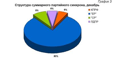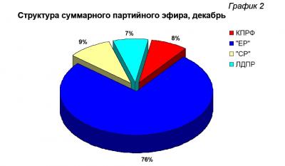 Таким образом, в декабре доля КПРФ в телеэфире упала по сравнению с ноябрём на 4% (8 вместо 12%). Одновременно резко возросла доля «Единой России» (с 68 до 76%). Это было связано с подведением итогов года первыми лицами государства.