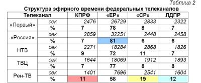 Эфирное время, отданное коммунистам, распределилось по каналам достаточно равномерно. Так, например, в ноябре разброс в процентах по телеканалам составлял от 3 до 23%, а в декабре – от 7 до 11%. В основном, это было связано с однотипностью выходящих на телеканалах сообщений. Их главными темами были подведение итогов выборов в Госдуму и регистрация кандидатов на Президентские выборы.