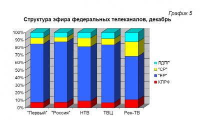 В декабре на пяти федеральных телеканалах четырём парламентским партиям было посвящено 37 часов 53 минуты 5 секунд новостного партийного эфира (Таблица 1).