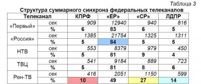 Максимальную долю суммарного синхрона предоставил коммунистам Рен-ТВ (10%). Остальные каналы выделили Компартии примерно одинаковое время: «Первый» - 6%, «Россия», НТВ и ТВЦ – по 5%.