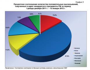 Итоговое процентное соотношение количества положительных высказываний, озвученных в адрес кандидатов на пост президента РФ за период 20 декабря по 13 января, составило: 47,6% от суммарного ИИБ – за В.В.Путиным, 13,8% - за Г.А.Зюгановым, 12,6% - за В.В.Жириновским, 11,6% - за С.М.Мироновым, 7,4% - за М.Д.Прохоровым, 6,9% - за Г.А.Явлинским и 0,1% - за Д.Ф.Мезенцевым (график 3).