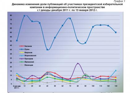 Динамический ряд, отражающий порядок наполнения медиа-потока публикациями о деятельности претендентов на главный государственный пост в Российской Федерации за период с 20 декабря 2011 г. по 13 января 2012 г. (график 1), позволяет заключить, что на 13 января пришёлся пик медиа-активности В.В.Жириновского, небольшое сокращение пространства информационного поля, отведённого В.В.Путину, при сохранении средних за рассматриваемый период показателей иных кандидатов в президенты РФ.