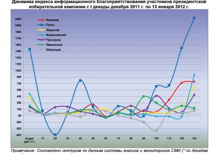 Динамика индекса информационного благоприятствования участников президентской избирательной кампании с I декады декабря 2011 г. по 13 января 2012 г.
