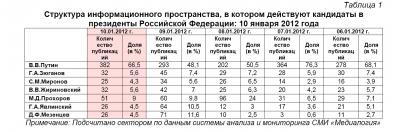 Контент-анализ публикаций СМИ с помощью системы «Медиалогия» позволил выявить следующую структуру информационного пространства, в котором действуют кандидаты на пост президента Российской Федерации (таблица 1).