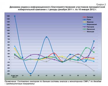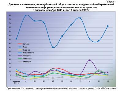 Динамический ряд, отражающий порядок наполнения медиа-потока публикациями о деятельности претендентов на главный государственный пост в Российской Федерации за период с 20 декабря 2011 г. по 10 января 2012 г. (график 1), позволяет заключить, что рассматриваемый день не внёс каких-либо изменений в обозначившуюся ранее тенденцию.