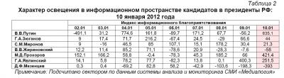 Характер освещения в информационном пространстве кандидатов в президенты РФ: 10 января 2012 года