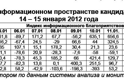 Проведённый анализ позволяет заключить, что 14 – 15 января 2012 г. В.В.Путин сохранил доминирующее положение по степени представленности в информационном пространстве, однако процентная доля его присутствия в медиа-потоке существенно сократилась. В итоге, кандидату в президенты РФ от партии власти удалось занять 52,7% - 14 января (при 60,1% - днём ранее) и 49,5% - 15 января, чему соответствовало 205 и 51 публикация соответственно. Носили они, преимущественно, одобрительный характер, что выразилось в полученном им индексе информационного благоприятствования (ИИБ) в 1064,4 – 14 января и 518,4 – на следующий день (против ИИБ, равного 2228,2, – 13 января).