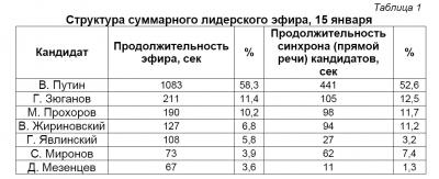 15 января на телеканалах основное количество эфирного времени получил В. Путин – 18 минут 3 секунды (58%). М. Прохоров получил 10% федерального политического лидерского эфира, В. Жириновский – 7%, Г. Явлинский – 6%. С Миронову и Д. Мезенцеву досталось по 4% телеэфира.