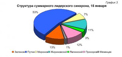 Что касается синхрона (прямой речи) лидеров, то 15 января его структура аналогична: В. Путин получил 53% эфирного времени, М. Прохоров – 12%, В. Жириновский – 11%. С. Миронову досталось 7% прямой речи, Г. Явлинскому – 3%, Д. Мезенцеву – 1%.