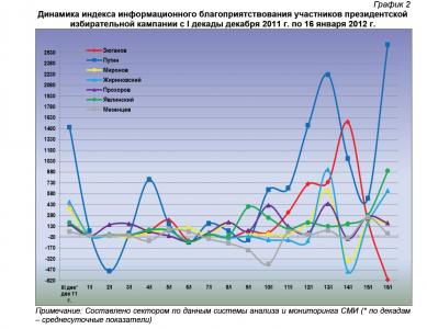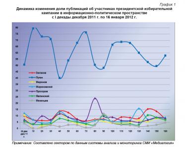Динамический ряд, отражающий порядок наполнения медиа-потока публикациями о деятельности претендентов на главный государственный пост в Российской Федерации за период с 20 декабря 2011 г. по 16 января 2012 г. (график 1), позволяет заключить, что 16 января информационные показатели всех кандидатов в президенты РФ были близки к средним за рассматриваемый период значениям.