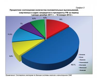 Итоговое процентное соотношение количества положительных высказываний, озвученных в адрес кандидатов на пост президента РФ за период 20 декабря по 16 января, составило: 48,7% от суммарного ИИБ – за В.В.Путиным, 14% - за Г.А.Зюгановым, 11,3% - за В.В.Жириновским, 9,9% - за С.М.Мироновым, 8,5% - за Г.А.Явлинским, 7% - за М.Д.Прохоровым и 0,6% - за Д.Ф.Мезенцевым (график 3).