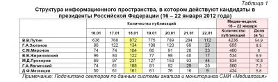 Контент-анализ публикаций СМИ с помощью системы «Медиалогия» позволил выявить следующую структуру информационного пространства, в котором действуют кандидаты на пост президента Российской Федерации (таблица 1).