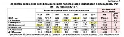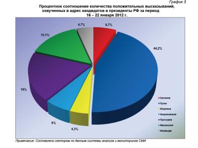 За период 16 – 22 января 2012 г. в информационном пространстве было зафиксировано 4236 упоминаний В.В.Путина или 54,9% от общего числа высказываний, озвученных в адрес участников президентской избирательной кампании. В 834 материалах (10,8%) фигурировал М.Д.Прохоров, в 655 (8,5%) – Г.А.Зюганов, в 560 (7,3%) – Г.А.Явлинский, в 534 (6,9%) – В.В.Жириновский, в 460 (6%) – С.М.Миронов, а в 434 новостных сводках (5,6%) – Д.Ф.Мезенцев.