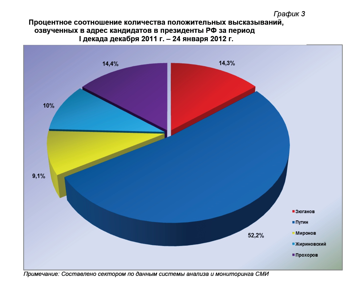 Итоговое процентное соотношение количества положительных высказываний, озвученных в адрес кандидатов на пост президента РФ за период 20 декабря по 24 января, составило: 52,2% от суммарного ИИБ – за В.В.Путиным, 14,4% - за М.Д.Прохоровым, 14,3% - за Г.А.Зюгановым, 10% - за В.В.Жириновским и 9,1% - за С.М.Мироновым (график 3).