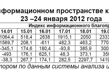 Проведённый анализ позволяет заключить, что 23 – 24 января 2012 г. В.В.Путин не только сохранил доминирующее положение по степени представленности в информационном пространстве, но и существенно укрепил его. В итоге, кандидату в президенты РФ от партии власти удалось занять 60% - 23 января (при 51,1% - днём ранее) и 62,9% - 24 января, чему соответствовало 834 и 922 публикации соответственно. Носили они исключительно одобрительный характер, что выразилось в полученном им индексе информационного благоприятствования (ИИБ) в 2269,9 – 23 января и 1767,5 – на следующий день (против ИИБ, равного 862,1, – 22 января).