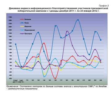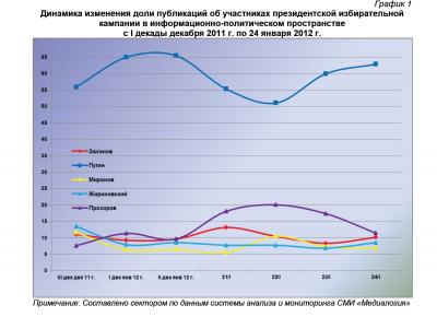 Динамический ряд, отражающий порядок наполнения медиа-потока публикациями о деятельности претендентов на главный государственный пост в Российской Федерации за период с 20 декабря 2011 г. по 24 января 2012 г. (график 1), позволяет заключить, что 23 – 24 января показатели всех кандидатов в президенты РФ были близки к средним за анализируемый период значениям.