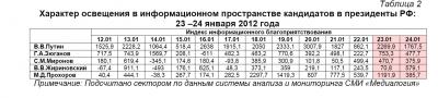 Проведённый анализ позволяет заключить, что 23 – 24 января 2012 г. В.В.Путин не только сохранил доминирующее положение по степени представленности в информационном пространстве, но и существенно укрепил его. В итоге, кандидату в президенты РФ от партии власти удалось занять 60% - 23 января (при 51,1% - днём ранее) и 62,9% - 24 января, чему соответствовало 834 и 922 публикации соответственно. Носили они исключительно одобрительный характер, что выразилось в полученном им индексе информационного благоприятствования (ИИБ) в 2269,9 – 23 января и 1767,5 – на следующий день (против ИИБ, равного 862,1, – 22 января).