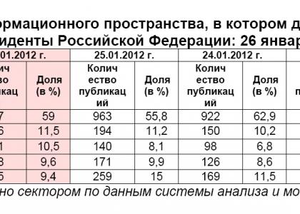 Проведённый анализ позволяет заключить, что 26 января 2012 г. В.В.Путин не только сохранил доминирующее положение по степени представленности в информационном пространстве, но и укрепил его по сравнению с предыдущим днём. В итоге, кандидату в президенты РФ от партии власти удалось занять 59% (при 55,8% - днём ранее) всего «кандидатского медиа-поля», чему соответствовало 907 публикаций. Носили они, преимущественно, одобрительный характер, что выразилось в полученном им индексе информационного благоприятствования (ИИБ) в 1655,6 (против ИИБ, равного 2603,2, – 25 января).