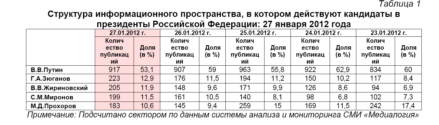 Контент-анализ публикаций СМИ с помощью системы «Медиалогия» позволил выявить следующую структуру информационного пространства, в котором действуют кандидаты на пост президента Российской Федерации (таблица 1).