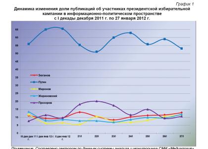 Динамический ряд, отражающий порядок наполнения медиа-потока публикациями о деятельности претендентов на главный государственный пост в Российской Федерации за период с 20 декабря 2011 г. по 27 января 2012 г. (график 1), позволяет заключить, что 27 января показатели Г.А.Зюганова, В.В.Жириновского и С.М.Миронова были близки к максимальному, М.Д.Прохорова – к минимальному, а В.В.Путина – к среднему за анализируемый период значению.