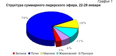 В период с 22 по 28 января 2012 года наибольшую долю лидерского федерального телеэфира получил В. Путин – 70% (8 часов 39 минут 51 секунду). В. Жириновский получил 11% эфирного времени, С. Миронов – 10%. М. Прохорову досталось 6%.