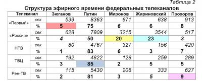 Г. Зюганову досталось 17 минут 26 секунд или 6%, что в 9 раз меньше, чем каналы выделили В. Путину, и в три раза меньше, чем В. Жириновскому и С. Миронову (График 2).