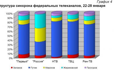 В. Путин получил наибольшую долю синхрона на НТВ и ТВЦ (80 и 75%). Предпочтение С. Миронову и В. Жириновскому отдал канал «Россия» (30 и 31%). М. Прохоров получил наибольшее количество прямой речи на Рен-ТВ (6%) (График 4).