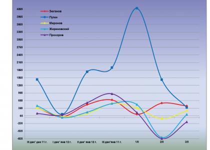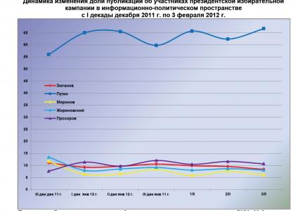 Динамический ряд, отражающий порядок наполнения медиа-потока публикациями о деятельности претендентов на главный государственный пост в Российской Федерации за период с 20 декабря 2011 г. по 3 февраля 2012 г. (график 1), позволяет заключить, что 3 февраля их показатели были близки к средним за рассматриваемый период значениям.