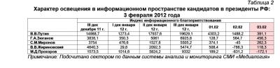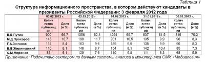 Контент-анализ публикаций СМИ с помощью системы «Медиалогия» позволил выявить следующую структуру информационного пространства, в котором действуют кандидаты на пост президента Российской Федерации (таблица 1).