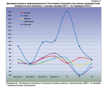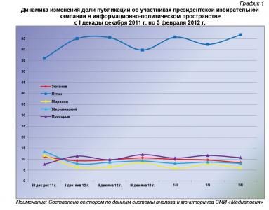 Динамический ряд, отражающий порядок наполнения медиа-потока публикациями о деятельности претендентов на главный государственный пост в Российской Федерации за период с 20 декабря 2011 г. по 3 февраля 2012 г. (график 1), позволяет заключить, что 3 февраля их показатели были близки к средним за рассматриваемый период значениям.