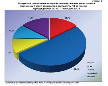 Итоговое процентное соотношение количества положительных высказываний, озвученных в адрес кандидатов на пост президента РФ за период 20 декабря по 3 февраля, составило: 50,8% от суммарного ИИБ – за В.В.Путиным, 14,7% - за Г.А.Зюгановым, 14,3% - за М.Д.Прохоровым, 10,2% - за В.В.Жириновским и 10% - за С.М.Мироновым (график 3).