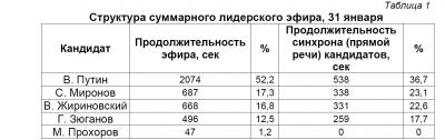 Что касается синхрона (прямой речи) лидеров, то 31 января его структура аналогична: В. Путин получил 36% эфирного времени, В. Жириновский и С. Миронов по 23%. М. Прохорову не было выделено синхрона.