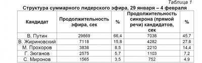 В период с 29 января по 4 февраля 2012 года наибольшую долю лидерского федерального телеэфира получил В. Путин – 66% (8 часов 17 минут 49 секунд). В. Жириновский получил 16% эфирного времени, М. Прохоров 9%, С. Миронов – 3%.