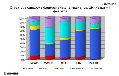 В. Путин получил наибольшую долю синхрона на Рен-ТВ и ТВЦ (72 и 63%). Предпочтение С. Миронову отдал «Первый» канал (10%). В. Жириновский получил наибольшее количество прямой речи на «России» и НТВ (по 39%), М. Прохорову – на «России» (22%). (График 4)