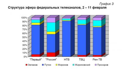 В. Путину была предоставлена наибольшая доля телеэфира на НТВ (91%). Однако нигде эта величина не опускалась ниже 47%. С. Миронов занял максимум эфира «России» и «Первого» (6 и 5%). В. Жириновский получил наибольшее количество эфира на «России» (24%). М. Прохорову наибольшее внимание также уделил телеканал «Россия» (12%). (График 3)