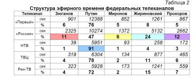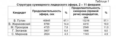 За период со 2 по 11 февраля на пяти федеральных телеканалах кандидатам на пост Президента было посвящено 16 часов 54 минуты 30 секунд новостного и информационно-политического эфира (Таблица 1).