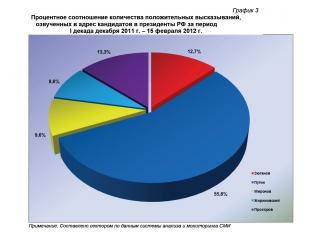 Итоговое процентное соотношение количества положительных высказываний, озвученных в адрес кандидатов на пост президента РФ за период 20 декабря по 15 февраля, составило: 55,8% от суммарного ИИБ – за В.В.Путиным, 13,3% - за М.Д.Прохоровым, 12,7% - за Г.А.Зюгановым, 9,6% - за С.М.Мироновым и 8,6% - за В.В.Жириновским (график 3).